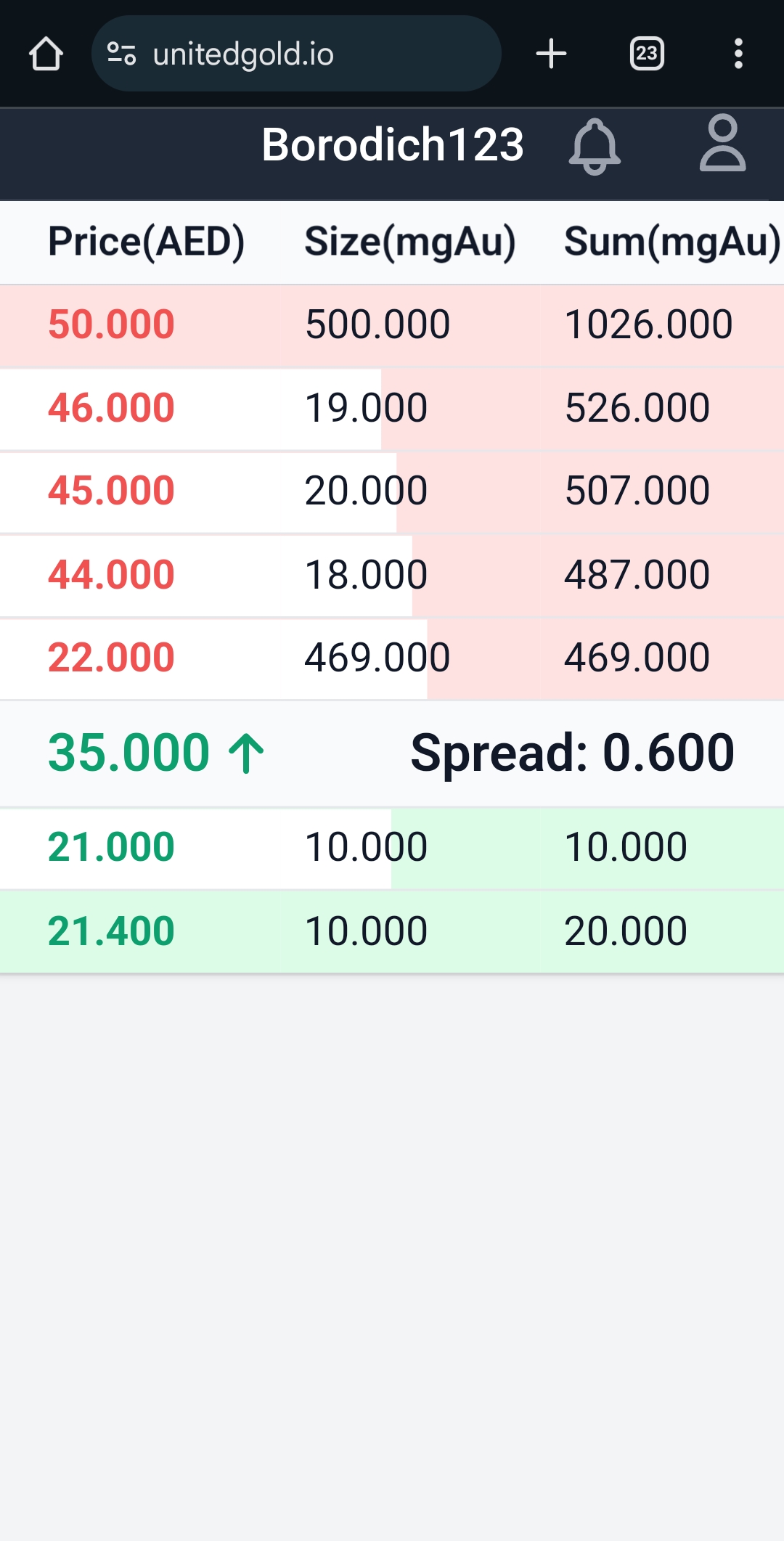 Если последняя сделка это покупка, то между сторонами стакана выводим зелёным и стрелка вверх.